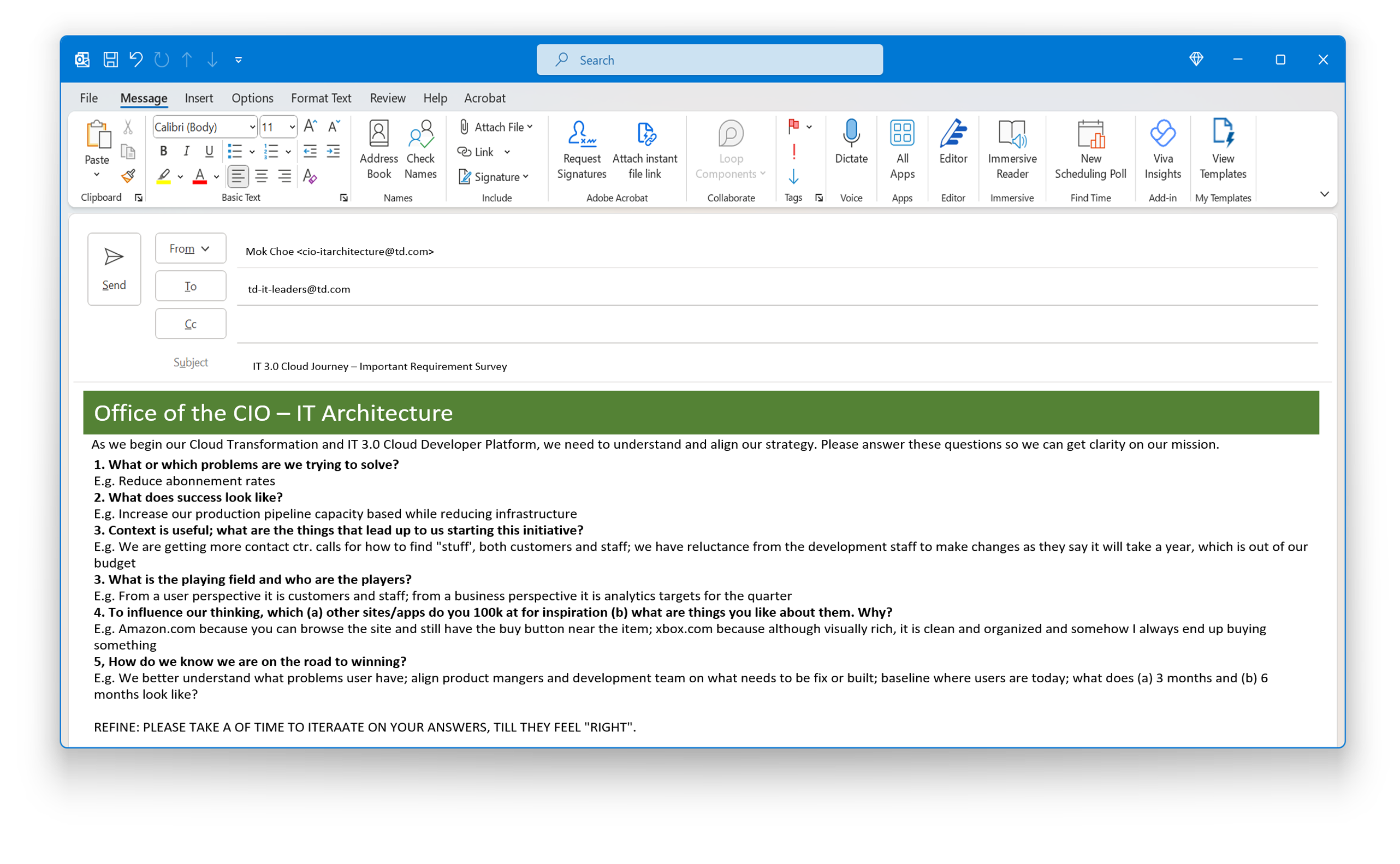 - The help this Digital Transformation, key questions were sent from the CIO's email to the major stakeholders, to not only give visibility, but help start the Change Management process from a common starting point.
